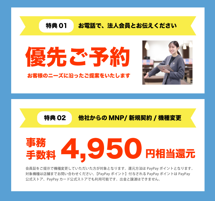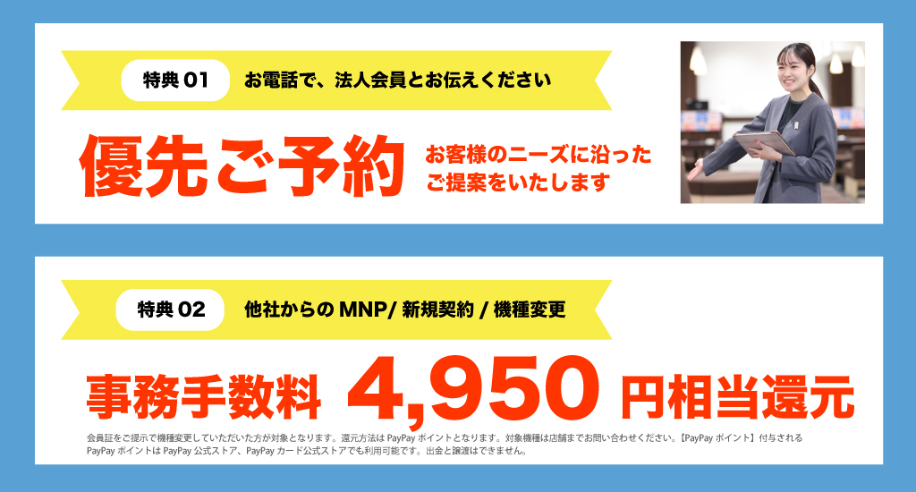 ご来店時の優先予約や、月々の携帯料金がお得になるプランのご提案など、会員様限定の様々な特典をご利用いただけます。